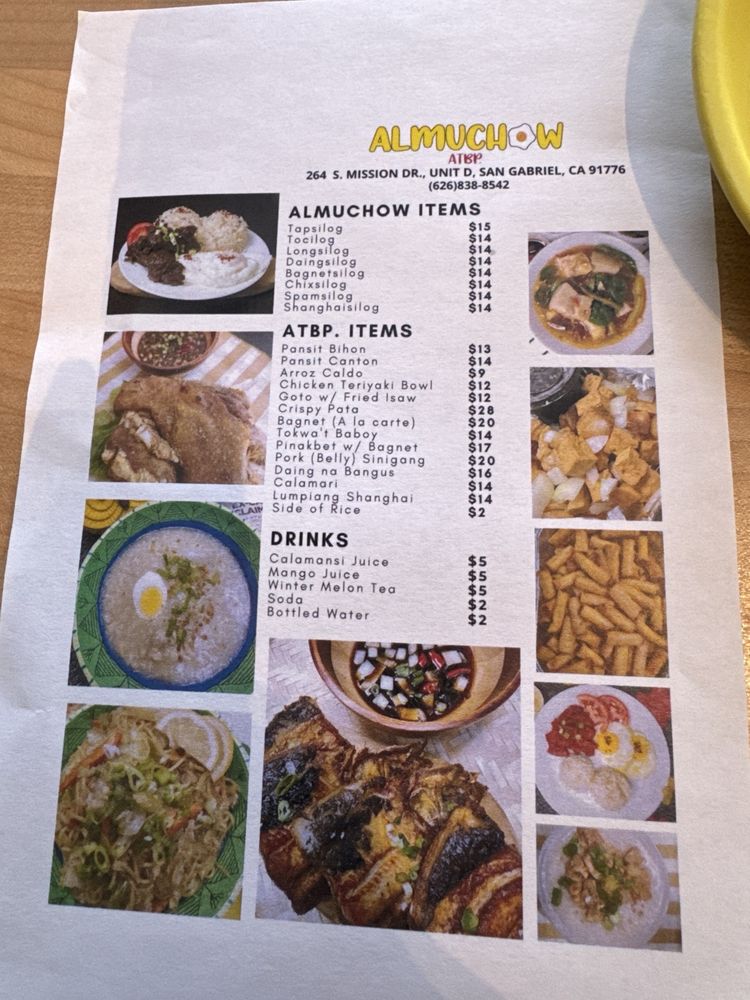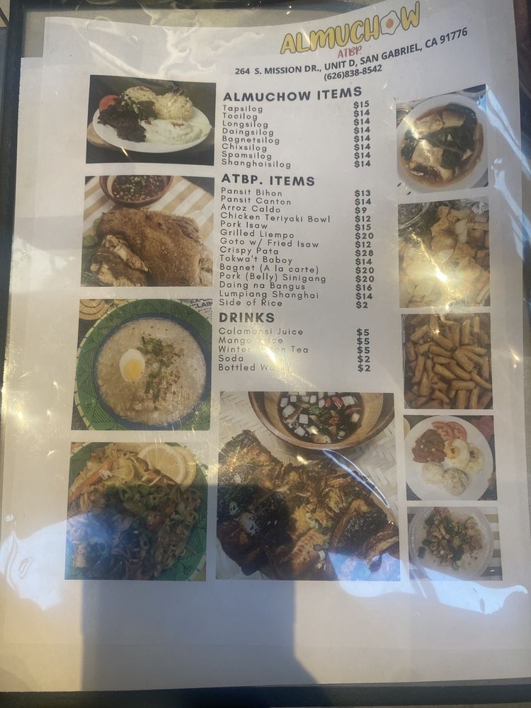 Welcome to Almuchow Atbp., a delightful addition to the culinary landscape of San Gabriel, California, where Filipino flavors take center stage. This cozy spot specializes in breakfast, brunch, and savory noodles, making it perfect for any meal throughout the day. With a robust menu that includes BBQ favorites like Chicken Skewers and Pork Skewers, alongside classic Filipino dishes such as Longsilog and Pansit Canton, there's something for everyone.
